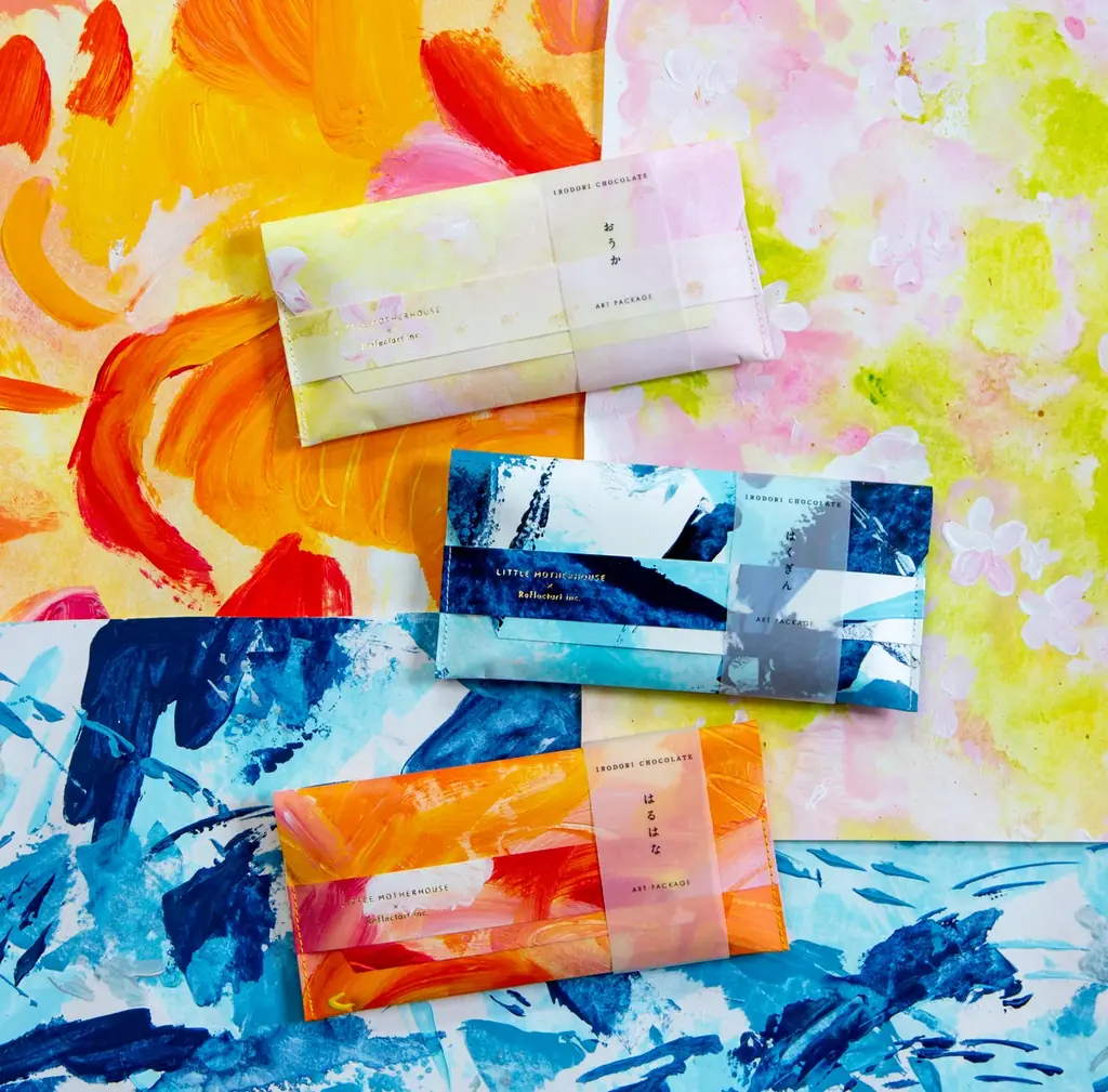 今回のラインナップでは、チョコレート本体だけでなくパッケージにも特徴があります。IRODORI CHOCOLATE ART PACKAGE(おうか・はくぎん・はるはな)は、人気の3種類のフレーバーをイメージしてアーティストがパッケージに直接絵を描いた一点物です。印刷では再現できない異なる柄が特徴で、チョコレートを食べ終わった後はマルチケースとして再利用できます。