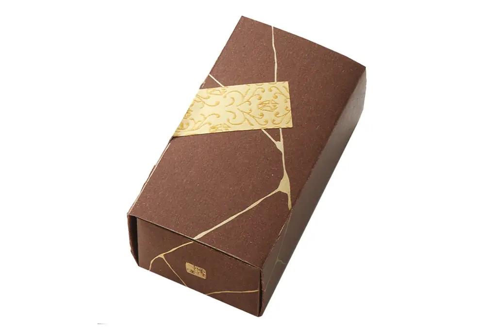 パッケージにはチョコレートをイメージした茶色の箱を採用し、そこに日本の美意識である金継ぎを想起させるゴールドのデザインをあしらっています。金継ぎは経年変化を肯定的に捉える美の思想であり、パッケージは「いつまでも相手を大切に思う気持ち」を表現しています。