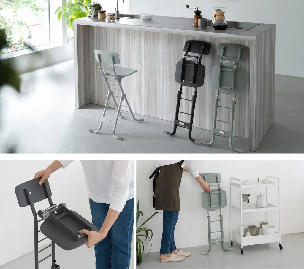 折りたたみ時の奥行は約15cmと浅く、狭い隙間や壁際に立てかけて収納しやすい寸法です。折りたたんだ状態でも見栄えの良さを重視しているため、収納場所が日常の視界に入るようなキッチンやリビング、オフィスや店舗でも圧迫感を抑えた佇まいで置けます。