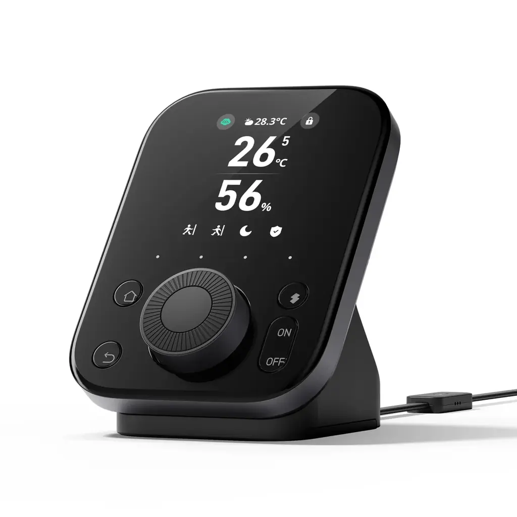 本体に備わるダイヤルは回すだけでエアコンの温度調節や照明の明るさ調整が行えるように設計されています。ディスプレイ表示と物理操作を組み合わせることにより、スマートフォンや音声アシスタントを使わずとも直感的に操作できます。