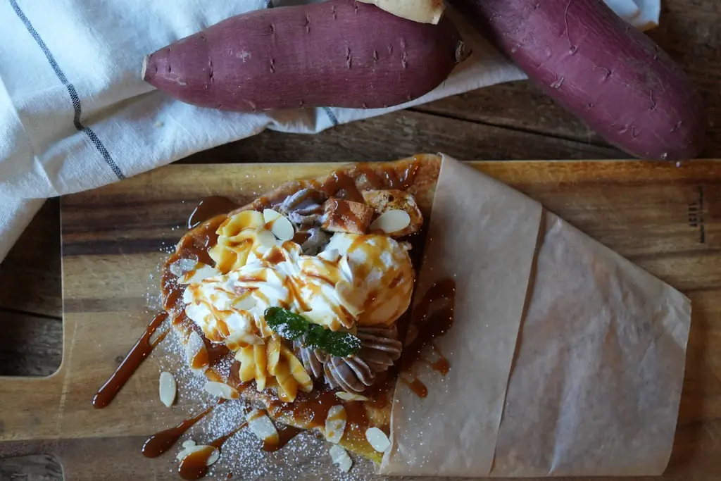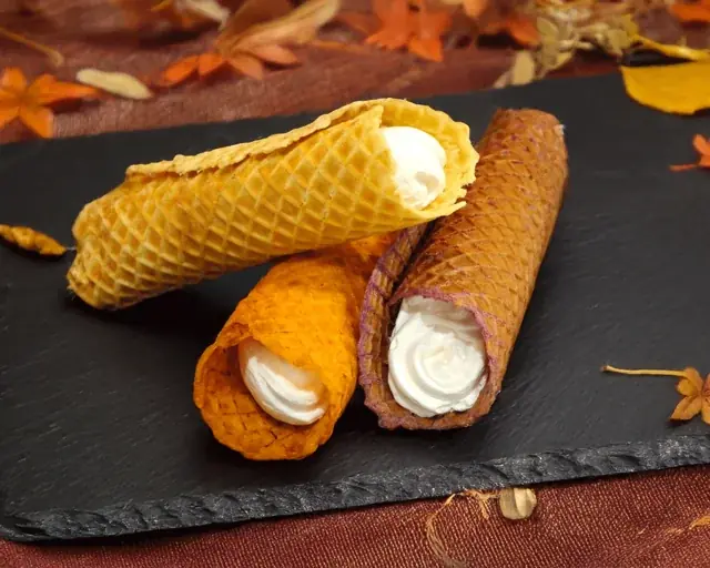 - おいもや 農家の台所(東京都羽村市) — 芋コローネ。生地はさつまいも100%・小麦不使用のワッフル生地にクリームを入れたコロネ。
