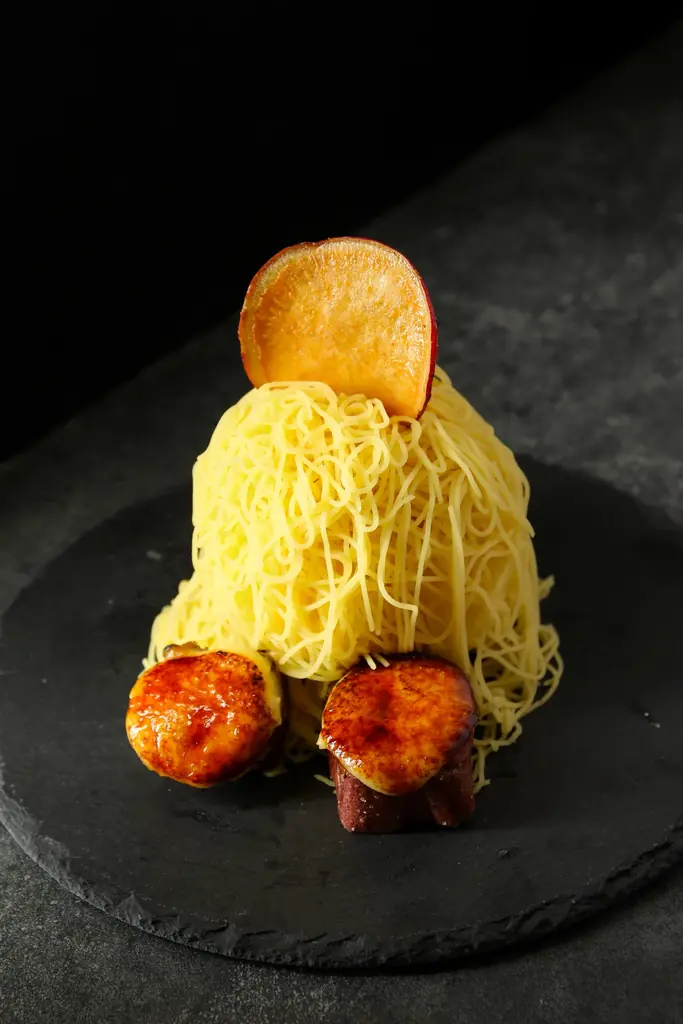 - 焼き芋スイーツ ほっこり芋 — 賞味期限7分!お芋の生絞りモンブラン。カットした金蜜芋にバニラアイスをのせ、仕上げに1mmモンブランを繊細にまとわせた一品。一口ブリュレとの相性をうたう。