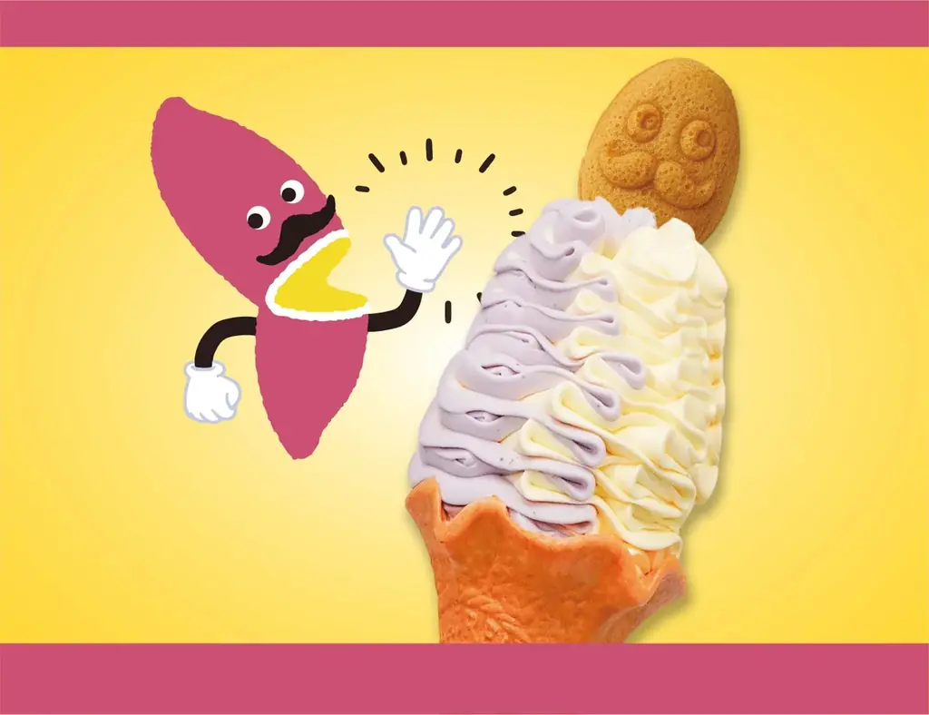 - らぽっぽ なめがたファーマーズヴィレッジ — おいもの花びらソフトクリーム(やきえもん焼きトッピング)。安納芋×紫芋の濃厚なおいもソフトに、やきいもの妖精「焼き右衛門」型のおいもカステラをのせた商品。