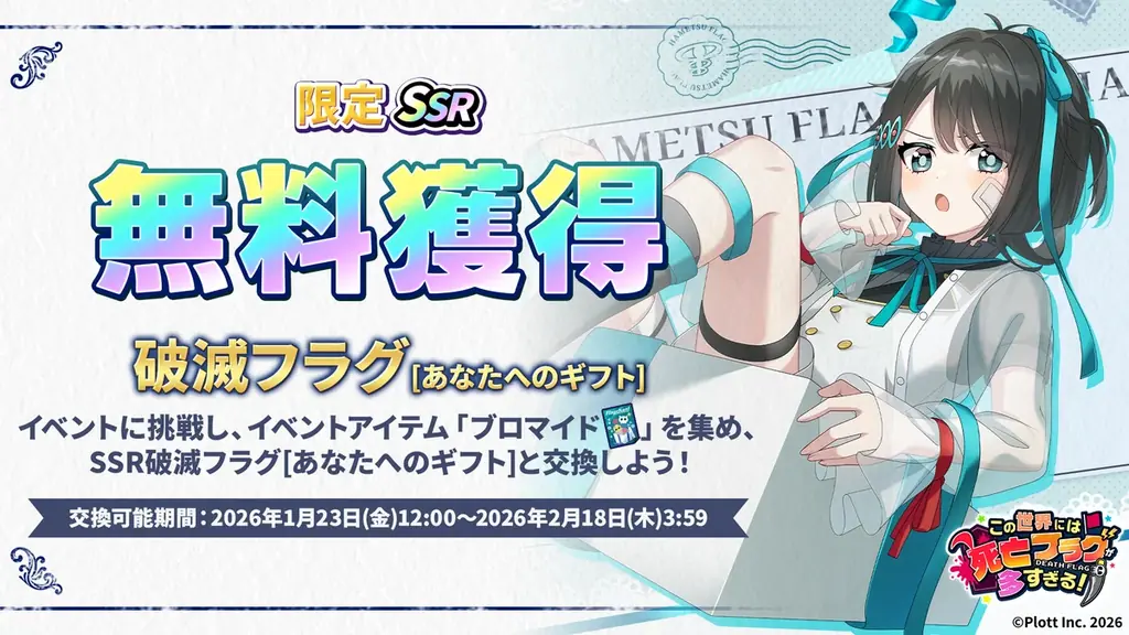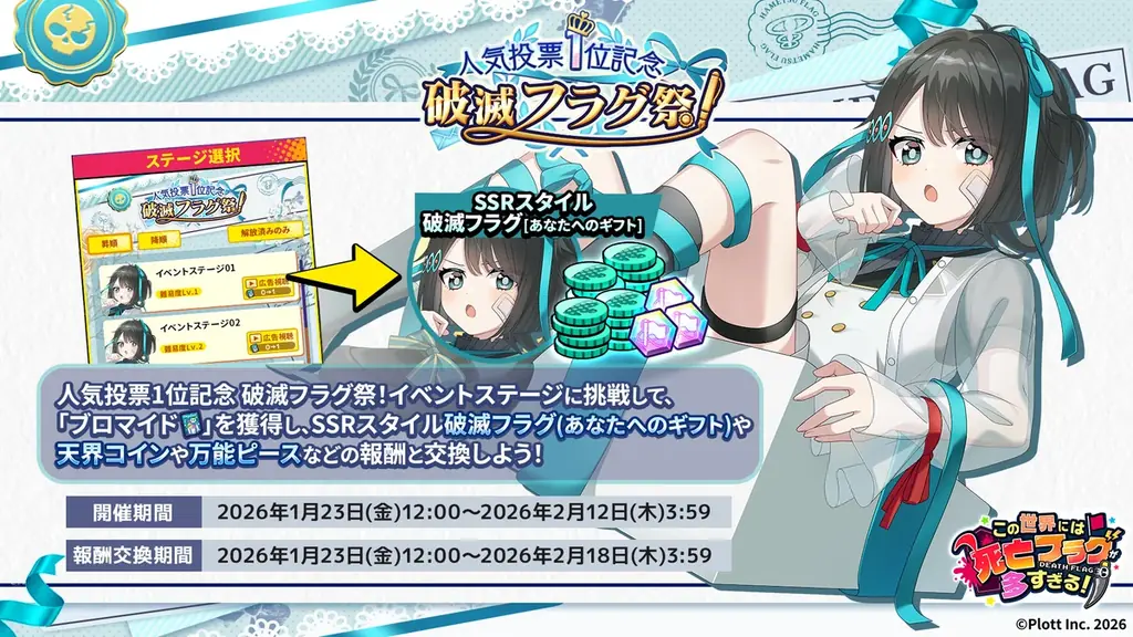 株式会社Plottが運営するスマートフォン向け放置RPG『この世界には死亡フラグが多すぎる!』(通称:このフラ!)において、人気投票1位を記念した期間限定イベント「人気投票1位記念 破滅フラグ祭」が開催されます。発表は2026年1月23日14:00付で行われ、イベントの主な狙いは人気投票の結果を反映した特別コンテンツの配信と、ゲーム内外での連動施策実施にあります。