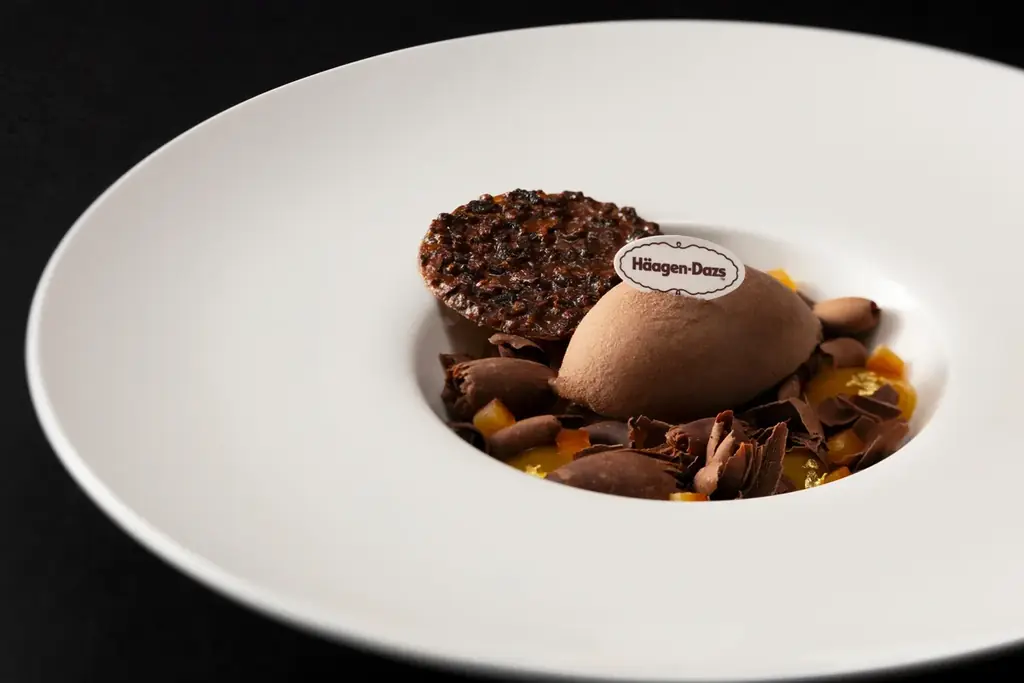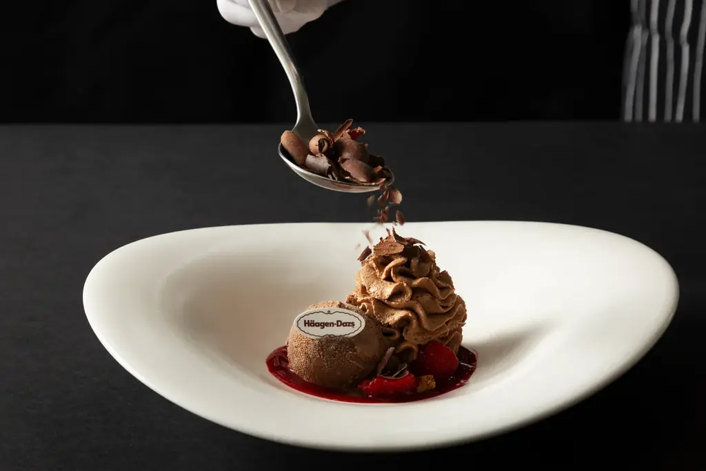 2月のライブクッキングメニューとして、「ムース・オ・ショコラ with ハーゲンダッツ」が提供されます。深い味わいのムースに甘酸っぱい木苺ソースとミルクチョコレートアイスクリームを添え、仕上げにカカオニブと削ったチョコレートを散らす内容です。