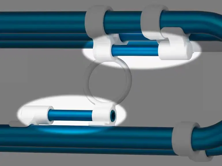 分岐管構造は、円筒管を分岐させる構造です。この構造を用いることで、円筒管でありながら円錐形管楽器の音響特性を実現することができます。分岐によって生じる干渉と倍音のバランスを設計上調整することで、トランペットに似た自然倍音列を生み出しています。