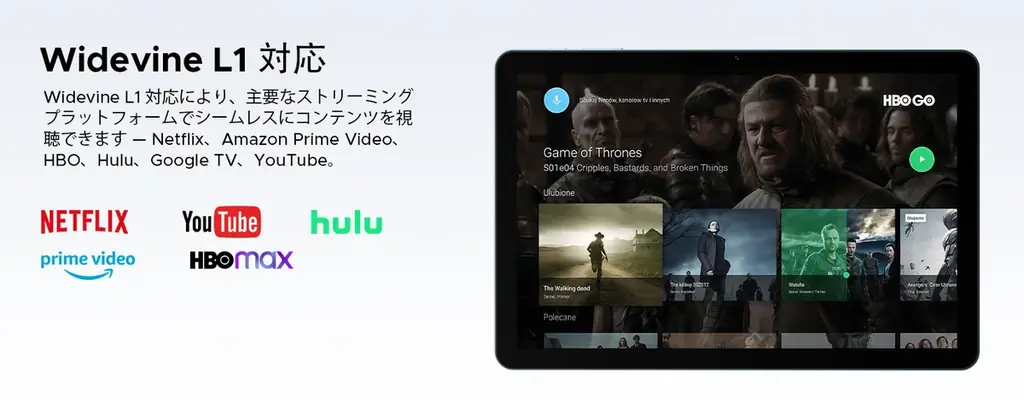 また、Widevine L1対応が明記されており、NetflixやYouTubeなど主要な動画配信サービスを高画質で再生できる点が強調されています。家庭内での動画視聴用途や外出先でのエンターテインメント端末としての使い勝手が設計段階から考慮されています。