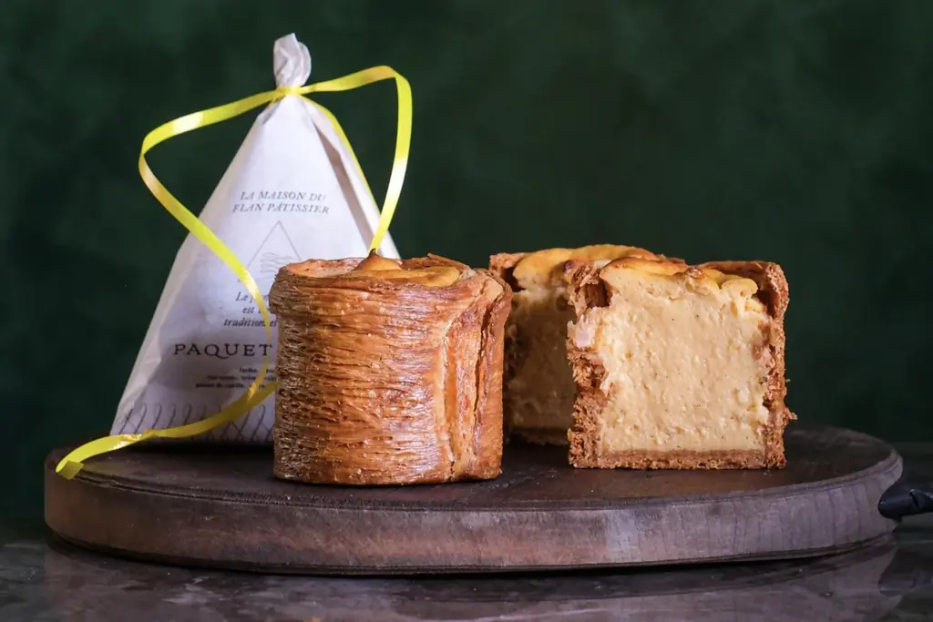 PAQUET MONTÉは“ちょっとよそゆきのフランスおやつ”をコンセプトに、無添加素材にこだわり、特殊な製法で作る「フラン・パティシエ」を代表商品とする専門店です。フランは多層のパイ筒と塩味を利かせたブリゼ生地を別焼きして組み立て、フラン液を流し込んで焼き上げる手間のかかる工程を採用しています。外側はパリサク、中はプルトロとした食感のコントラストが特長です。