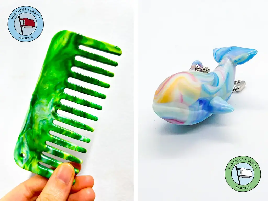 出品されているプロダクトはいずれも唐津地域で回収されたプラスチックを原料にしており、オランダ発のオープンソースプロジェクトPrecious Plasticの技術を活用して、手作業で再生・成形されています。素材由来の色や模様、製造工程で残る痕跡がそのまま製品の個性となるため、同じものが二つとない一点ものとなります。
