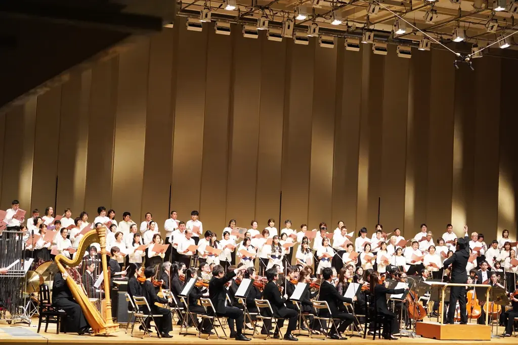 コンサートはまず、広島ゆかりの作曲家・川崎優氏による『祈りの曲 第1《哀悼歌》』で幕を開けた。和太鼓、合唱、手話、オーケストラが織りなす編成は、音響の厚みとともに聴衆へ深い印象を残した。