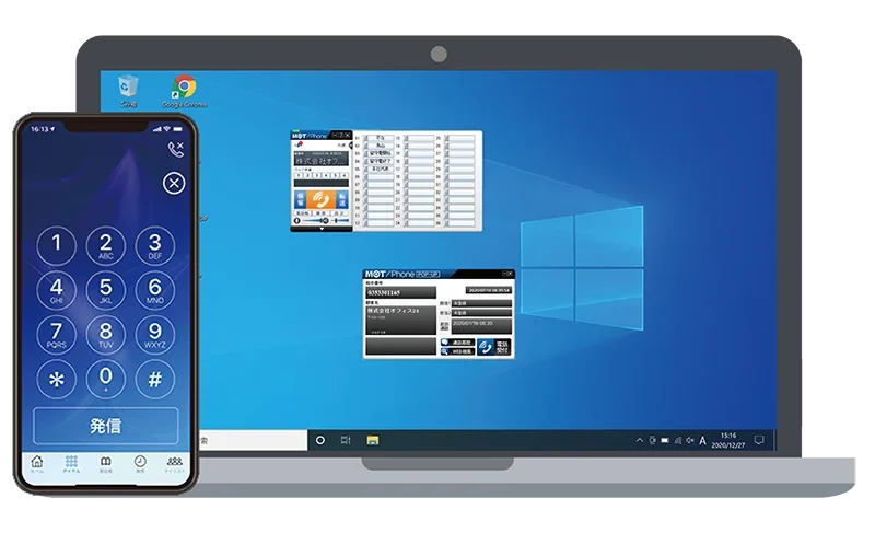 MOT/TEL はインターネット経由で電話機能を提供するクラウド型サービスで、スマホで会社番号を使った発着信が可能となるため、オフィス外での電話業務や拠点間の内線通話に対応している。業務効率化や顧客対応品質の向上を目的として導入されている。