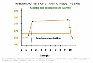 また、具体的なデータとして、NextGen®により安定化したL-アスコルビン酸(ピュアビタミンC)は40℃環境で3ヶ月間の安定性が示され、皮膚内での活性は10時間以上持続することが報告されています(Ex vivo評価:マイクロダイアリシス法による研究)。