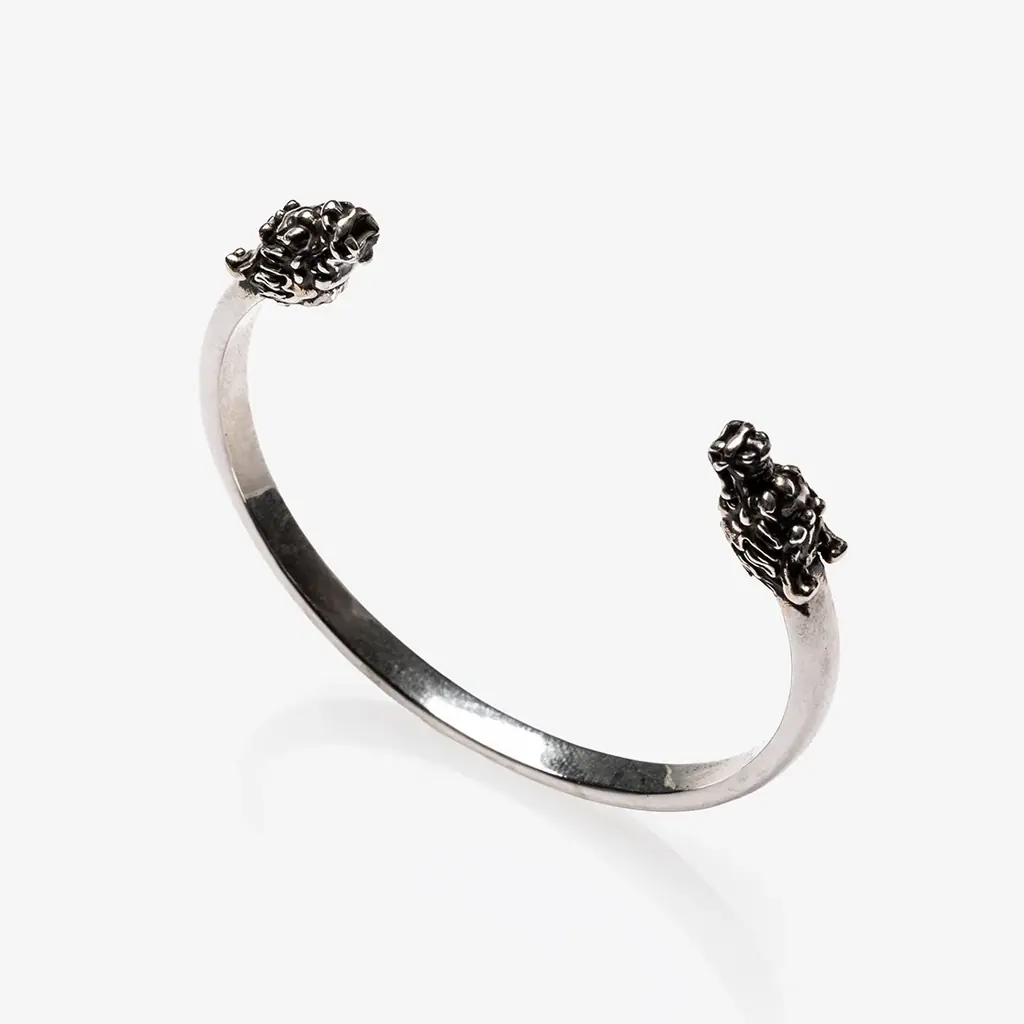 『伝説の龍を腕元に――桐生一馬の魂をあしらったバングル』。OX JEWELRyのアイコン的バングルを特注仕様に仕立て、龍の装飾を施したモデルです。程よい太さ・厚さで、幅広いコーディネートに馴染むベーシックなデザインが特徴です。