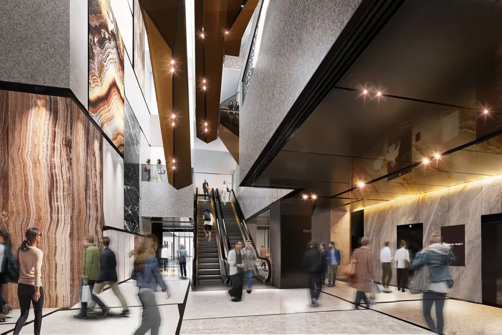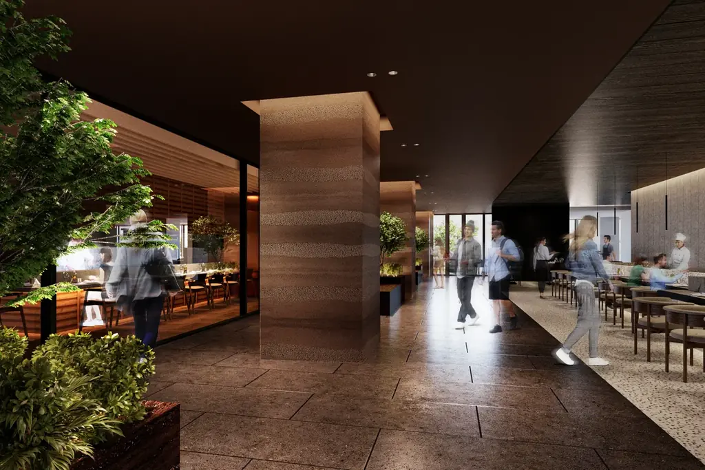 建築デザインにおいては、都市の中でひときわ存在感を放つランドマーク性を重視。商環境のインテリアは感性を刺激する仕上げとし、エントランスや吹き抜け空間には独自のアートを配して日常の中で印象に残る体験を提供する設えとしている。
