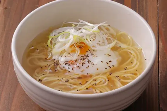 スープは鶏ガラをベースに、昆布と野菜の旨味をバランスよく合わせ、にんにく・生姜・胡椒・ごま油を効かせた塩味のスープです。温泉玉子をトッピングし、国産小麦を使用した麺との相性を重視している点が強調されており、食事の締めに適した一杯として位置づけられています。