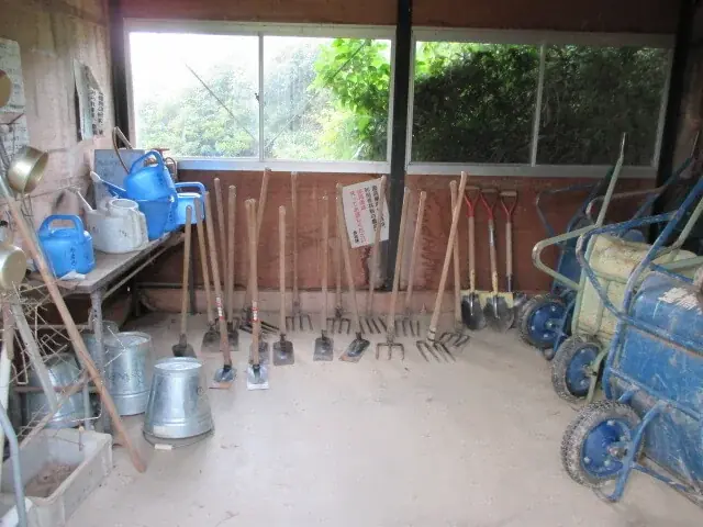 共用で常備されている主な農具には、鍬、備中(一種の鍬)、一輪車、ジョウロなどがあり、日常的な栽培作業を行う上で最低限必要な用具が準備されています。これにより初心者でも気軽に始められる環境が整備されています。