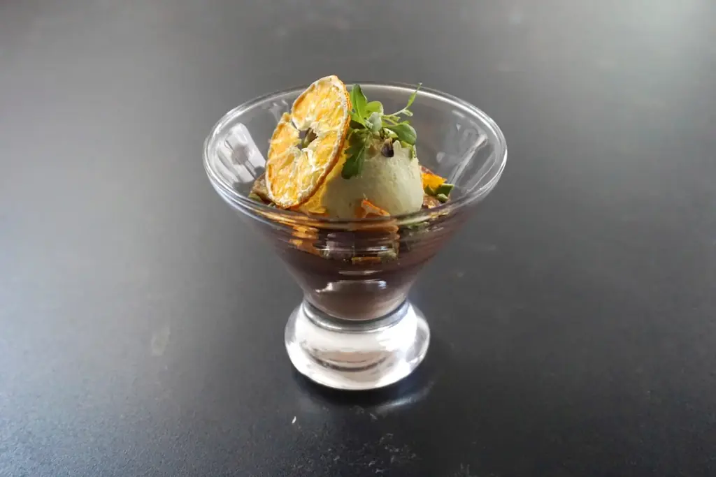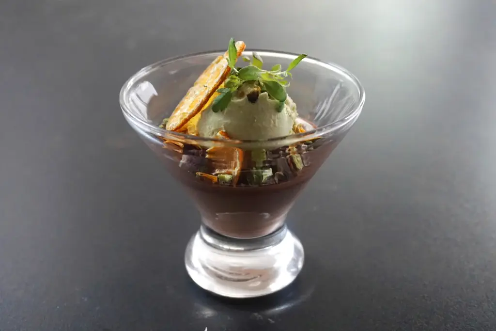 スイーツは複数の要素で構成され、味わいや食感のコントラストが意図的に設計されています。主要要素はチョコレートパンナコッタ、ピスタチオアイス、乾燥国産みかんのスライスです。