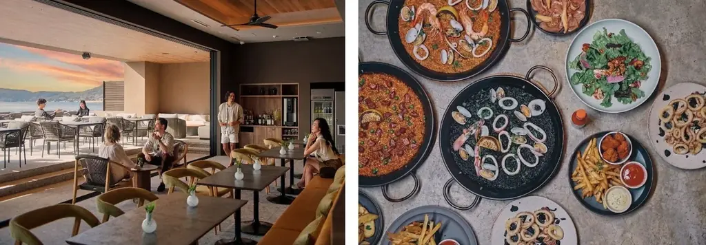料理の方向性は地中海料理やスパニッシュをベースにしつつ、讃岐の赤味噌や白味噌を取り入れたパエリア各種など、地域の食文化を反映した一皿を用意しています。飲み物は地酒・ワイン・地ビール・オリジナルリゾートカクテルを取り揃え、食の時間に合わせたペアリングが可能です。