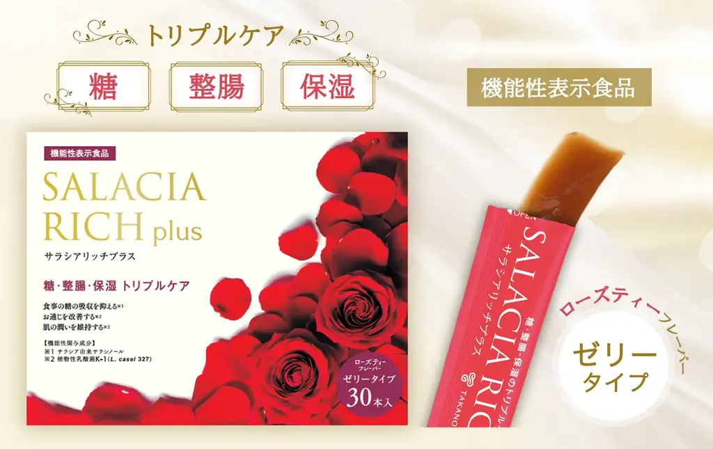 『サラシアリッチプラス』はエステサロン向けの機能性表示食品で、水を必要としないゼリータイプです。ローズティーフレーバーを採用しており、試作品段階で社内女性社員によるアンケートで味の絞り込みを行っています。