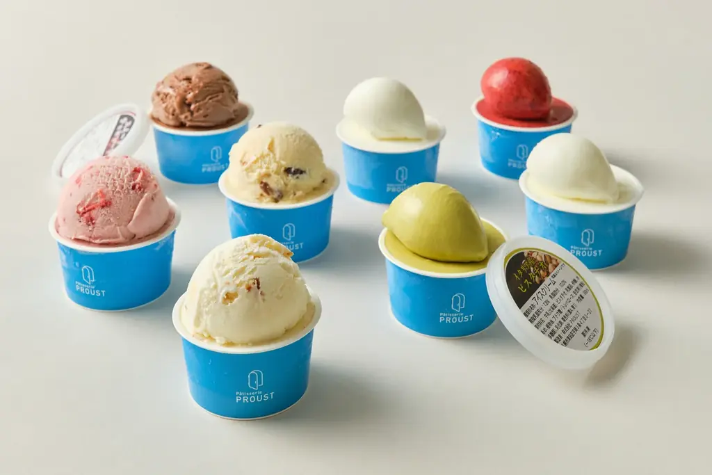 持ち帰りや手土産に適したプルーストオリジナルカップアイスは各400円(税込)で、以下の全8種類のフレーバーが用意されています。