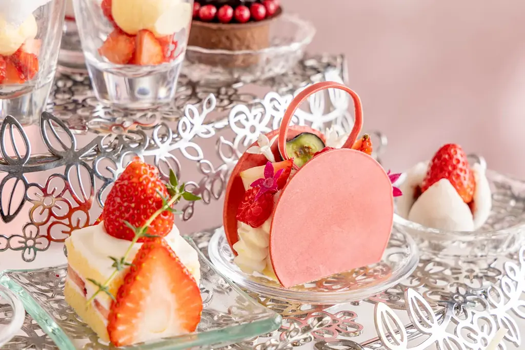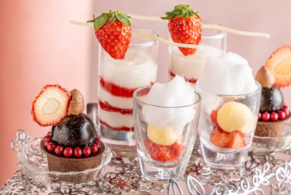 スイーツは、いちご本来の甘みと酸味を活かした品から、チョコレートやマスカルポーネを組み合わせた味わい深いものまで揃っています。食感や見た目に工夫を凝らした品も多く、食べ比べが楽しめる構成です。