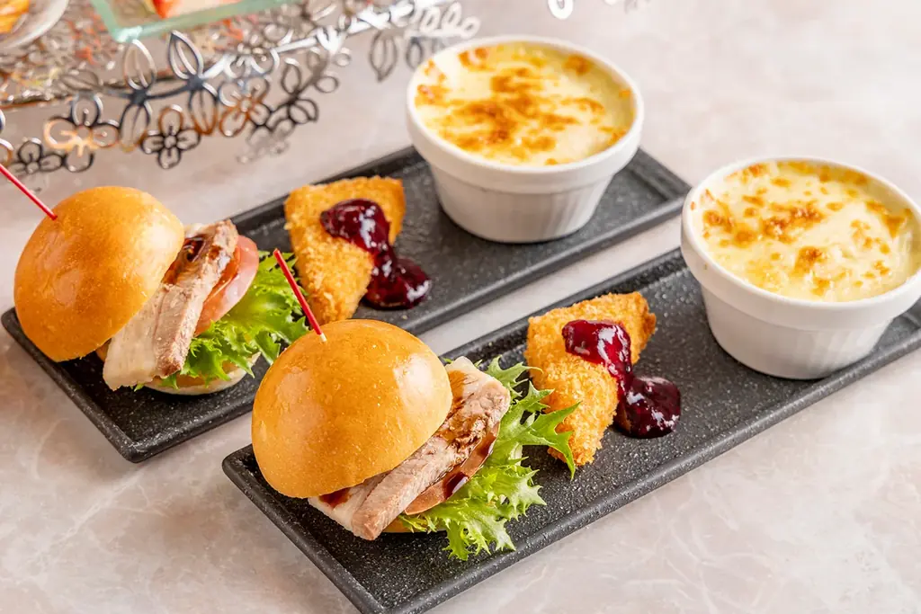 セイボリーは甘さの合間に挟む主張のある料理として位置付けられており、バーガーやドリア、フライといった食べ応えのある3種が揃います。また、ワゴンサービスのプレーン/いちごスコーンや4種のサンドイッチは、お席でお好きなだけ楽しめる形で提供されます。