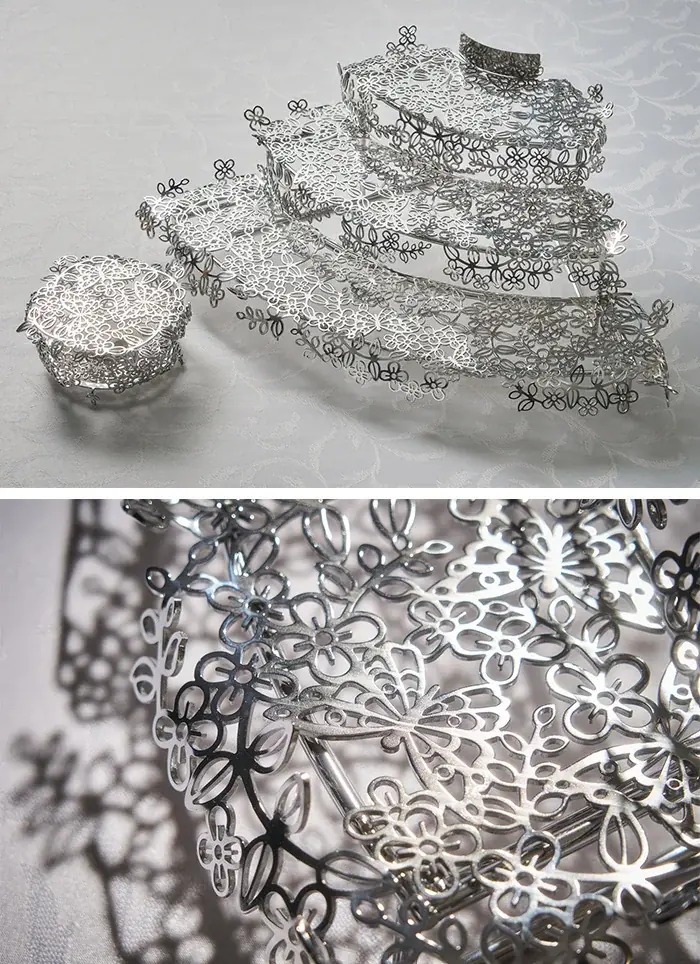 今回のアフタヌーンティーで使用されるオリジナルスタンドは、D-écrudesign(ディ・エクリュデザイン)による制作です。ブランドディレクターの徳永彌生氏がステンレスの端材に注目し、特殊な研磨技術でテーブルウェアへと仕上げました。