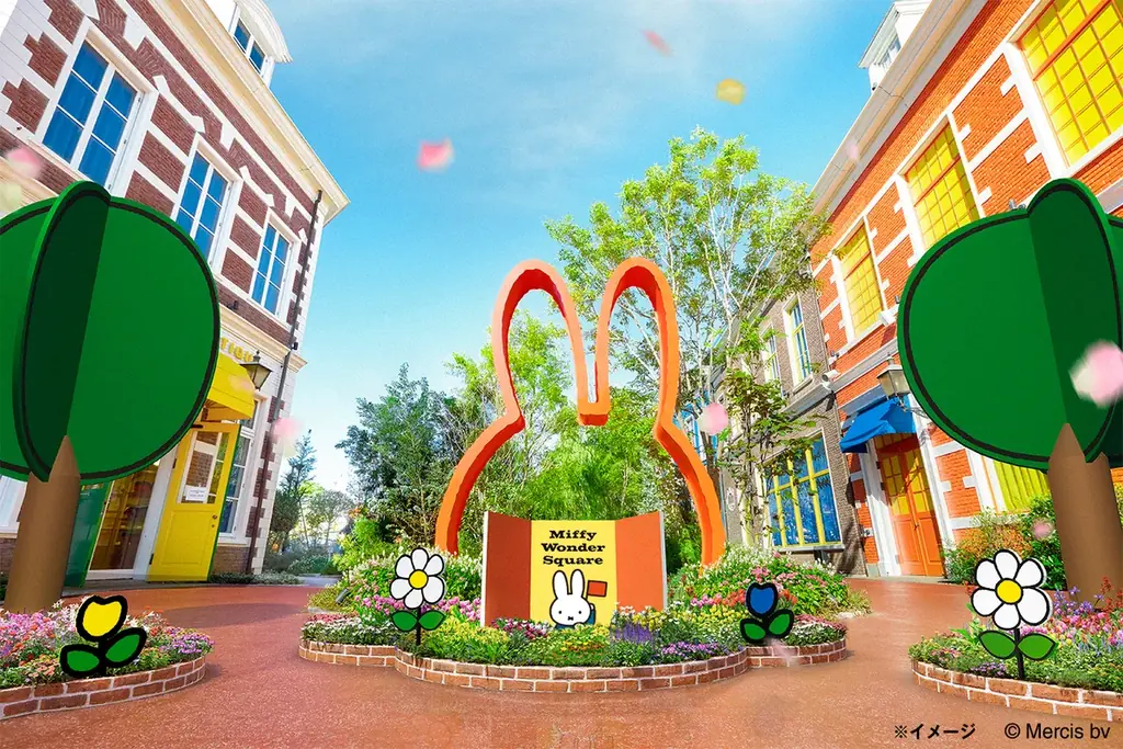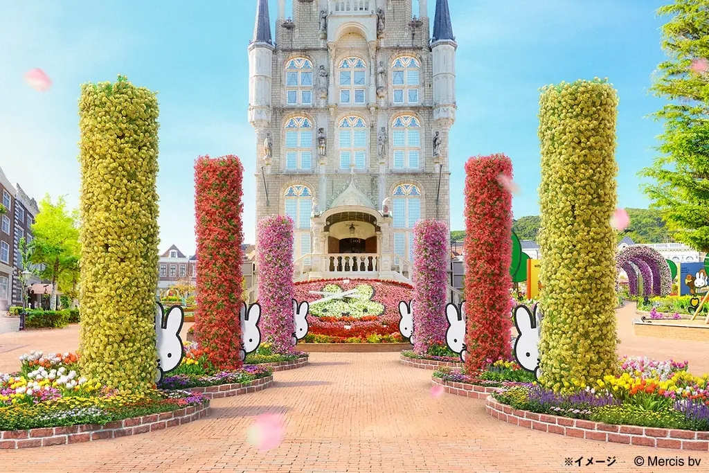 今回新登場する「ミッフィーのフラワーブルームガーデン」は、アムステルダムシティ内にある花の広場を中心に展開します。春に咲き誇る本物の花々と、ミッフィー絵本の世界観をモチーフにしたフォトパネルやトピアリーが組み合わさり、この季節ならではの景色をつくり出します。
