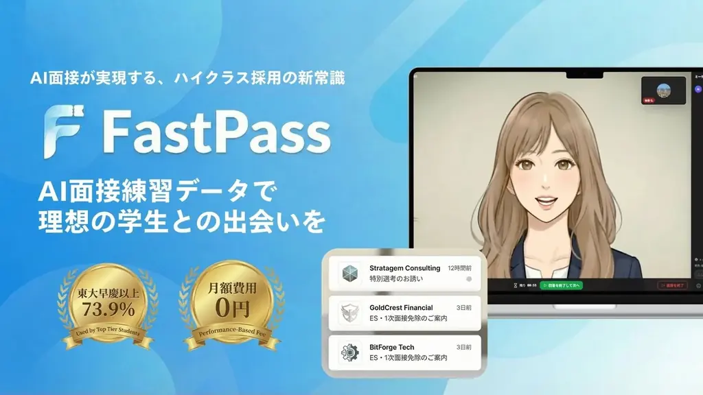 同社はまた、2026年5月にAI採用マッチングサービス「FastPass」をリリース予定です。FastPassはAIアバターとの面接練習データを活用し、企業と優秀な学生をマッチングするサービスで、登録学生の73.9%が東大・早慶以上を占める点を示しています。サービスは完全成果報酬型で導入時の固定費は0円とされ、現在先行申込を受け付けています。