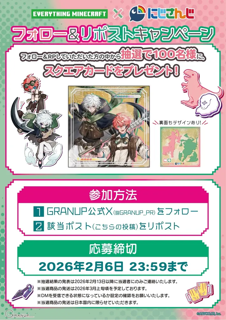 株式会社GRANUPは、VTuber/バーチャルライバーグループ「にじさんじ」所属の赤城ウェンと叢雲カゲツを起用したコラボレーションキャンペーンを、運営するEVERYTHING MINECRAFT一部店舗およびGRANUP SHOP(ECサイト)にて実施します。開催期間は2026年2月7日(土)~3月6日(金)です。