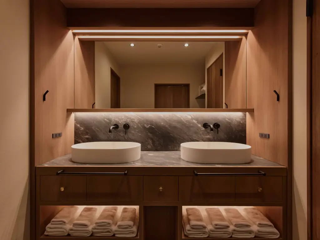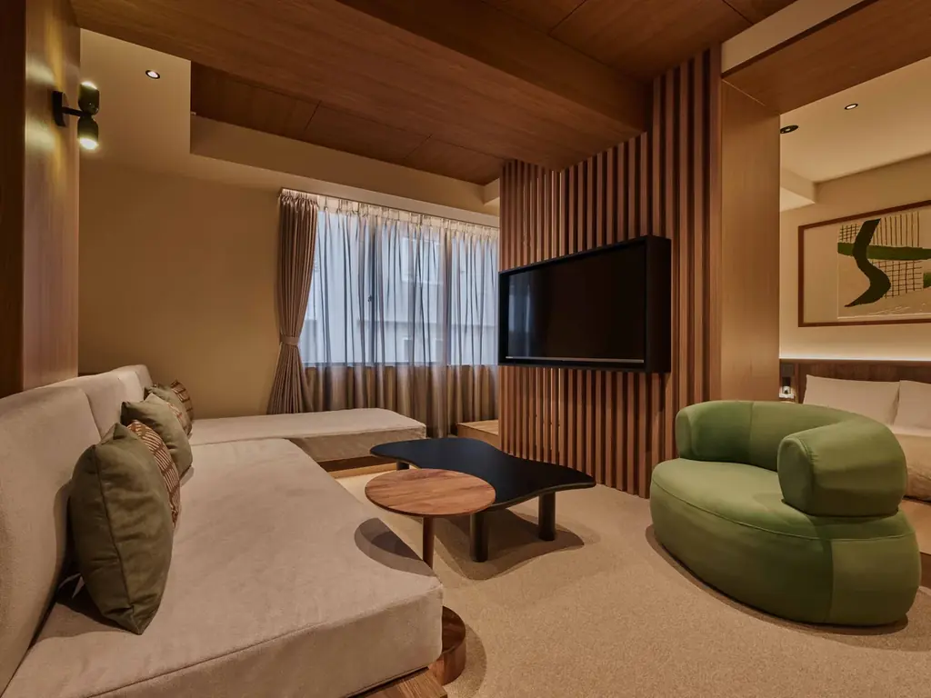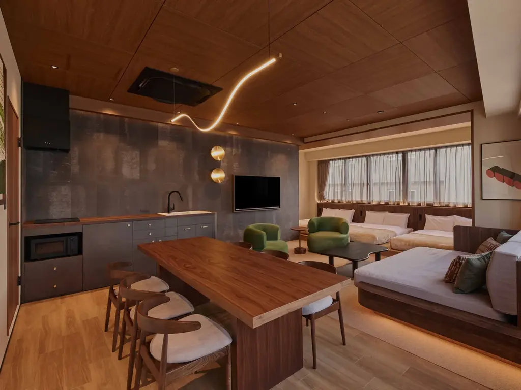 空間設計は「それぞれの過ごし方に寄り添うゾーニング」として、リビング・ダイニング・キッチン・洗面スペースを客室内にそろえ、滞在者が“暮らすように滞在できる”ことを重視しています。各所に施した間接照明や素材感によって、時間の流れが緩やかに変わる「余白の美」を体感できるようデザインされています。