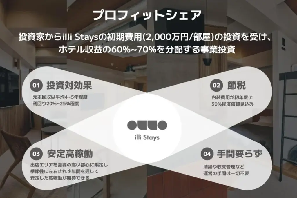 投資家向けにはプロフィットシェア事業としてのスキームを提示しています。投資家は物件オーナーとして賃貸契約を締結し、入居保証金や内装施工費など初期費用を負担する一方、運営はBNSが一括して担当します。投資家は毎月の運営レポートを受け取ることで状況を確認でき、初期コストの減価償却を活用した節税効果や宿泊料収入からの利益分配、所有施設の宿泊利用といった付加価値を享受できます。