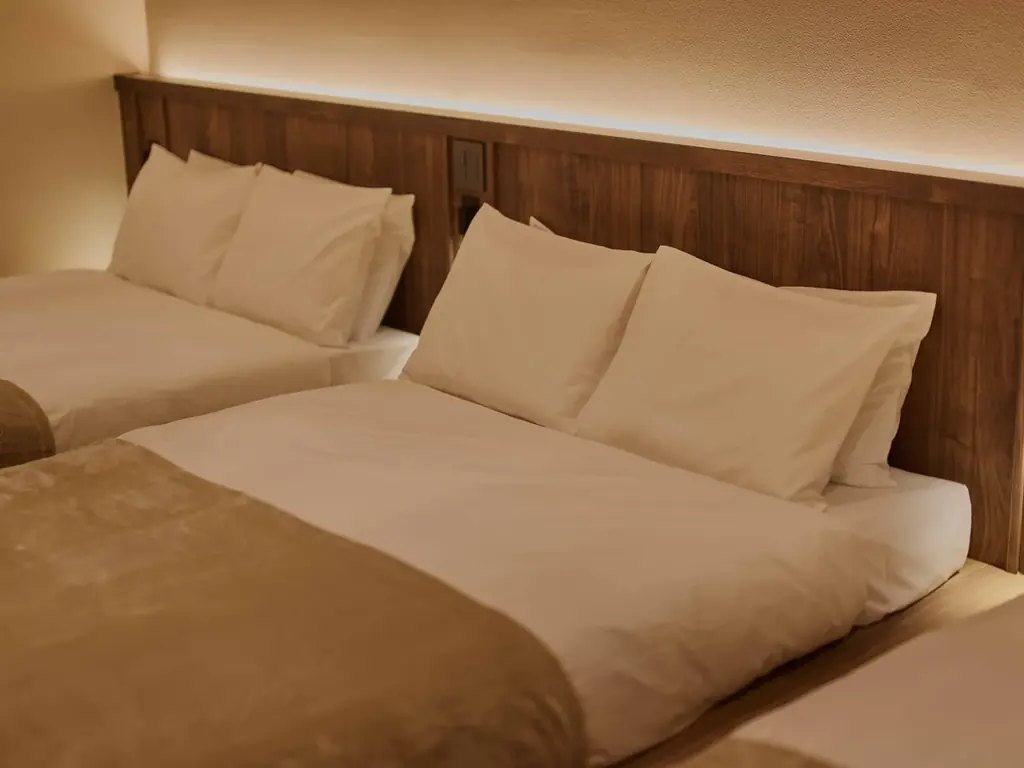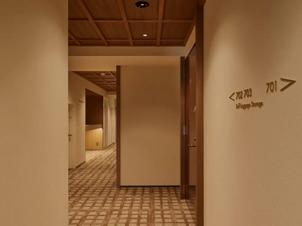 客室は最大8名定員で、グループ滞在向けに最適化されています。6階・7階には共有エリアが設けられており、個室だけでなく共用空間でも滞在者同士の交流や作業が可能です。室内アートや家具の配置にも配慮し、見た目と機能の両立を図っています。
