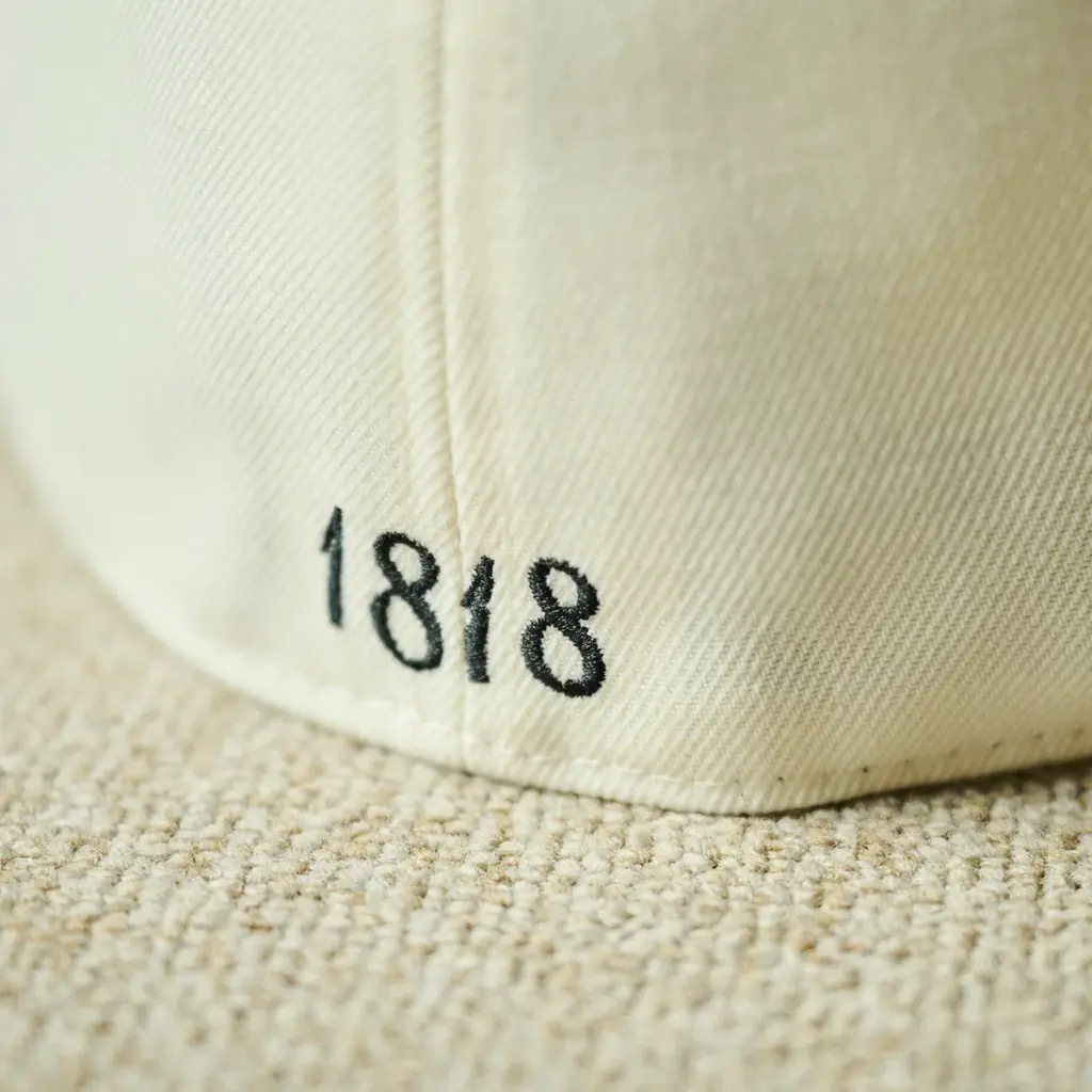 59FIFTY®をベースにしたコラボモデルは、フロントパネルが柔らかい「ソフトバックラム」仕様を採用しています。フロントに大きめのゴールデン フリース、バックにはブルックス ブラザーズの創業年である1818の刺繍が施されたクラシックなデザインです。