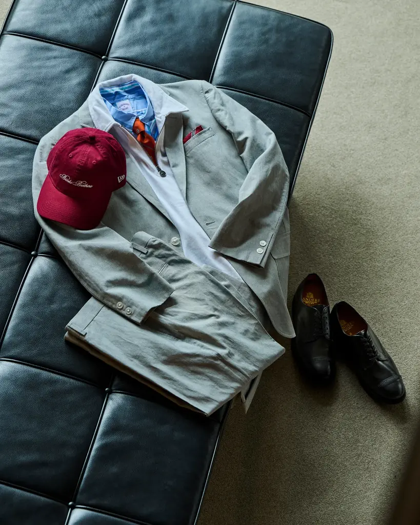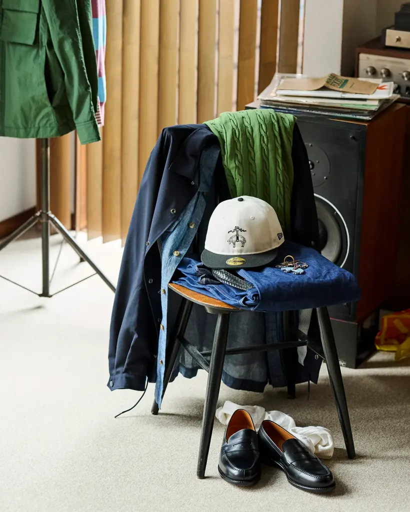また、ネイビーカラーの59FIFTY®は定番のブレザー合わせを多色使いでドレスダウンするスタイルも提案されています。ブレザーとキャップの組合せでアメトラを現代的にアップデートしています。スタイリング担当:Masahide Takeuchi。