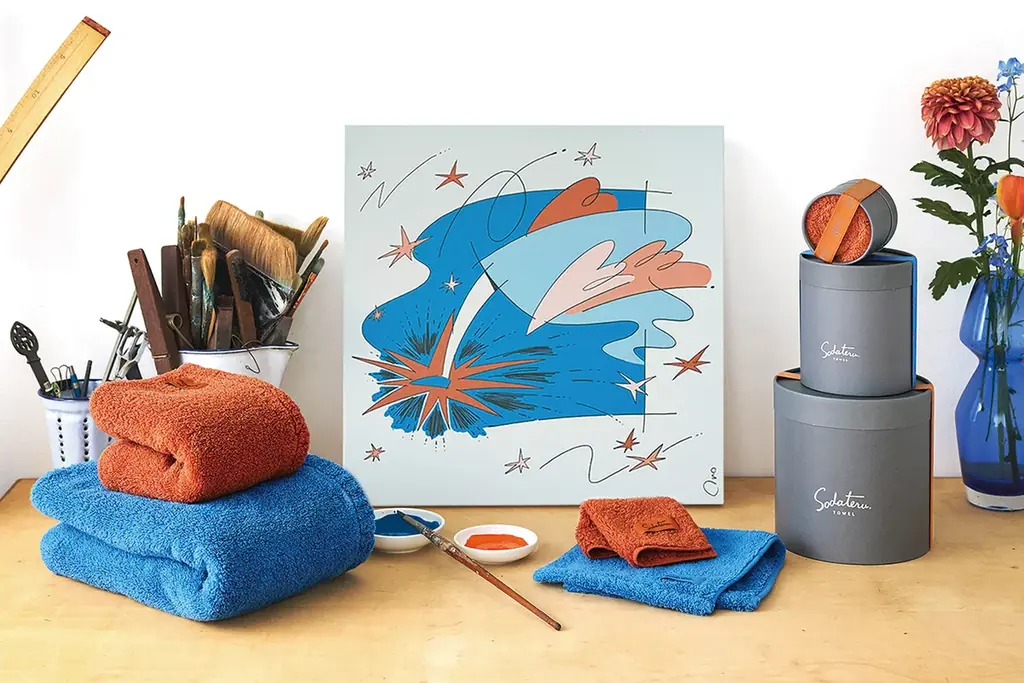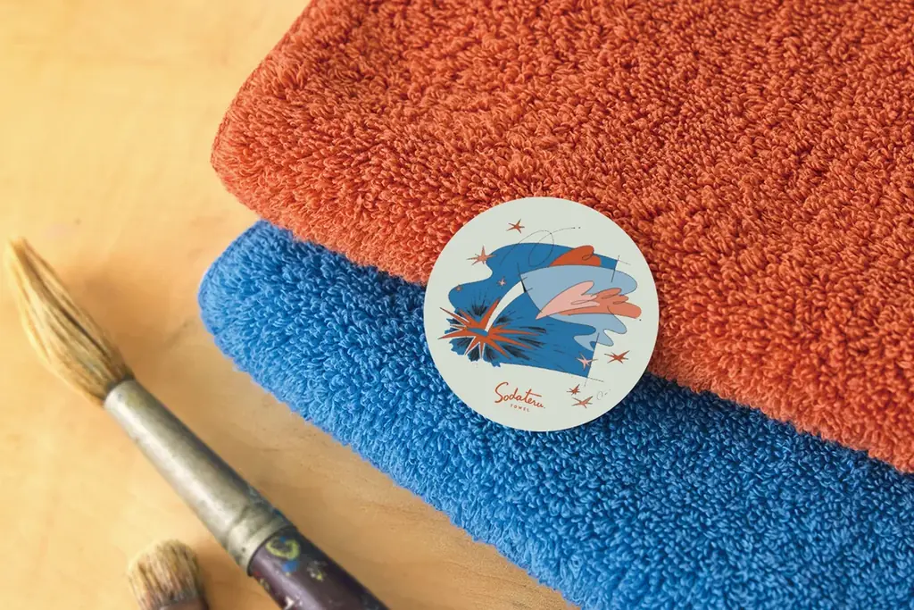 限定カラーのタオルにはOno氏によるコンセプトアートをノベルティシールとして商品に同梱します。シールはコレクション要素として保持することも想定されており、アートとプロダクトを結びつける役割を担います。