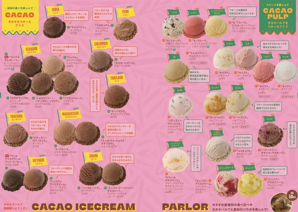 | 代表的なカカオワールド商品 | 【トモエサヴ―ル】オリエンタルアイスカカオストレートティー 660円、チョコバナシ 柿カカオフラッペ 1,100円、プラスショコラ EL CEIBO カカオティラミススムージー(アルコール1,540円/ノンアルコール990円)、カカオハンターズ×モロゾフ 濃厚ガトーショコラとチョコレートプリン 648円 |
