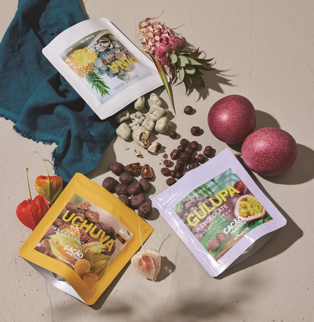 カカオハンターズは、コロンビアでカカオの調査、開発、栽培から自社工場での製造までを一貫して行うメーカーです。会場には、パッションフルーツ、パイナップル、ほおずきなどのフルーツを取り入れた商品も並びます。