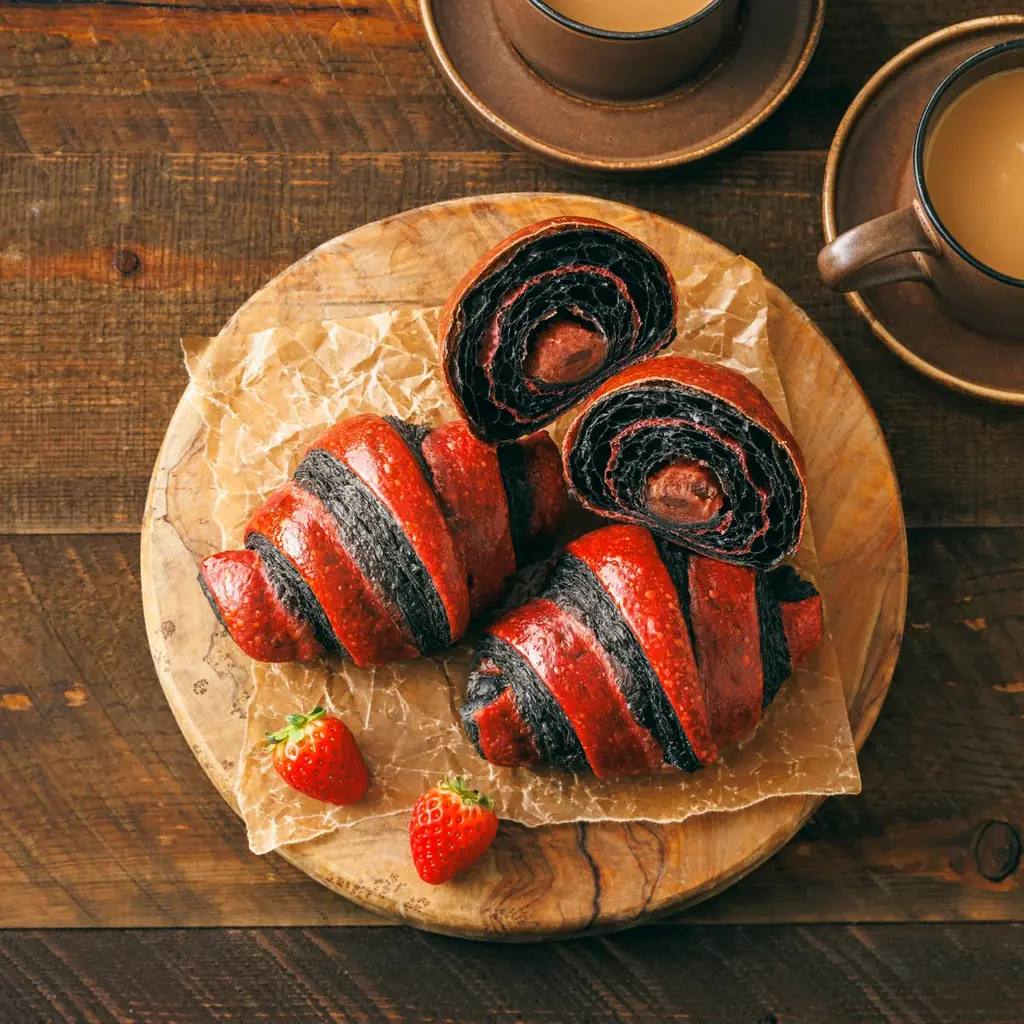 商品説明:赤と黒の深みのある色合いの生地に、あまおう苺あんとチョコを包んだあんクロワッサンです。チョコの甘みとあまおう苺あんのほのかな酸味があわさり、さっぱりとした後味を楽しめます。