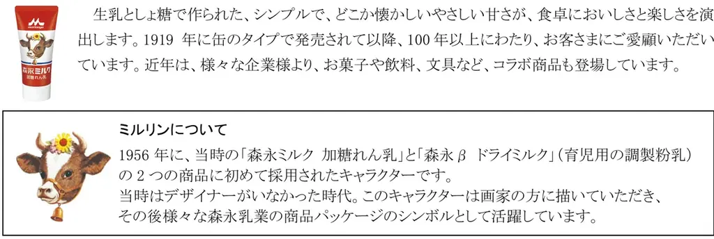 | パッケージ | 「森永ミルク 加糖れん乳」を想起させる赤色基調、キャラクター「ミルリン」採用 |
