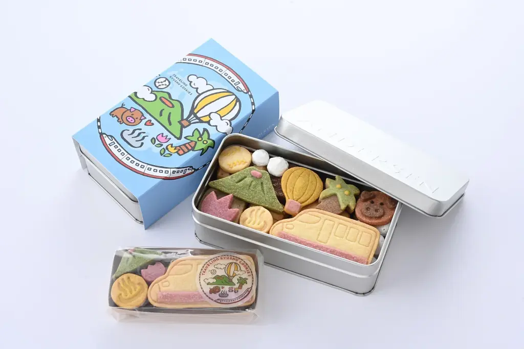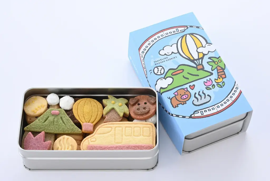 | 旅する九州クッキー缶 | 3,700円(税抜) / 税込3,996円 | 福岡:野球ボール、佐賀:気球、長崎:チューリップ、熊本:阿蘇山、大分:温泉、宮崎:ヤシの木、鹿児島:黒豚、列車、その他合計8種類のクッキー入り |