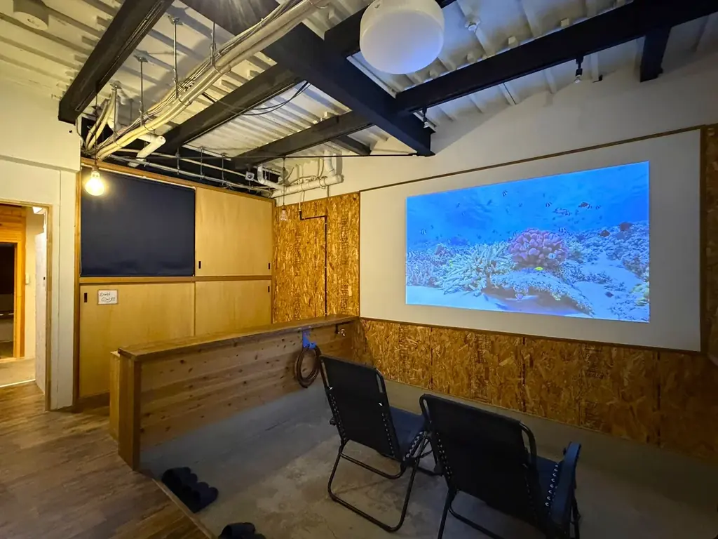 サウナエリアの隣にはプロジェクターを備えたシアタールームがあり、映画や動画、ゲームなどを楽しみながらサウナ後のリラックスタイムを過ごすことができます。プライベート利用にも適した空間設計です。