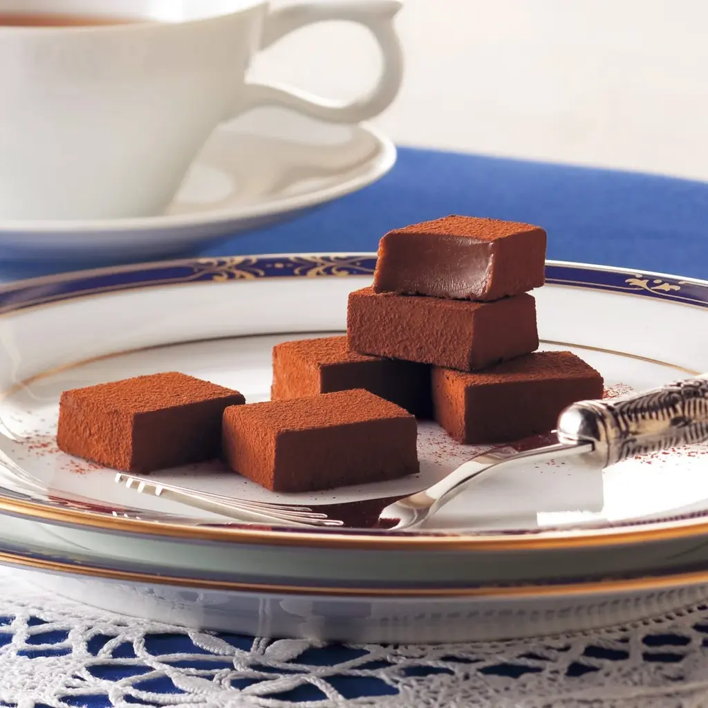 生チョコレート[ティラミス]は、イタリアのデザート「ティラミス」をイメージした数量限定品です。マスカルポーネチーズのパウダーを使ったホワイトチョコのガナッシュと、コーヒーにコーヒーリキュールを加えたガナッシュを2層に重ね、ココアパウダーをまぶしています。チーズのコクとコーヒーの香りが特徴です。