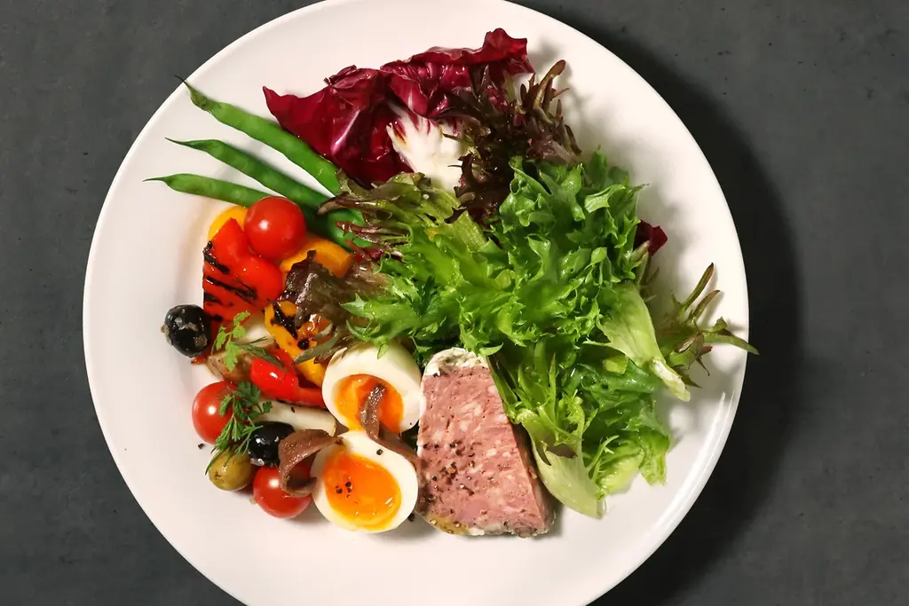 - ニース風サラダと京鴨のパテ・ド・カンパーニュ:南仏ニースの定番サラダに、旨み豊かな京鴨のパテ・ド・カンパーニュを添えた一皿。