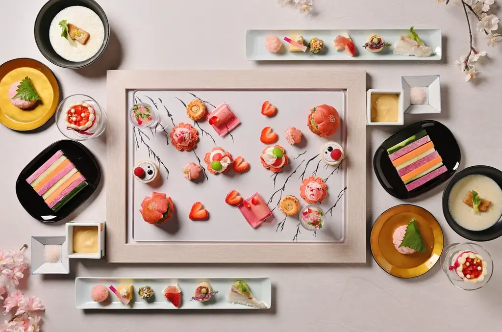 本企画は和食料理長・後藤孝宏、パティシエ・須田悦夫、ベーカリー・小牧若奈の三者がコラボレーションして仕上げたもので、春の京都を感じさせる食材と見た目の美しさを重視した構成が特徴です。額縁に描かれたイラストにスイーツをセットして一枚の“桜のアート”を完成させる演出など、視覚と味覚の両面で春を表現します。