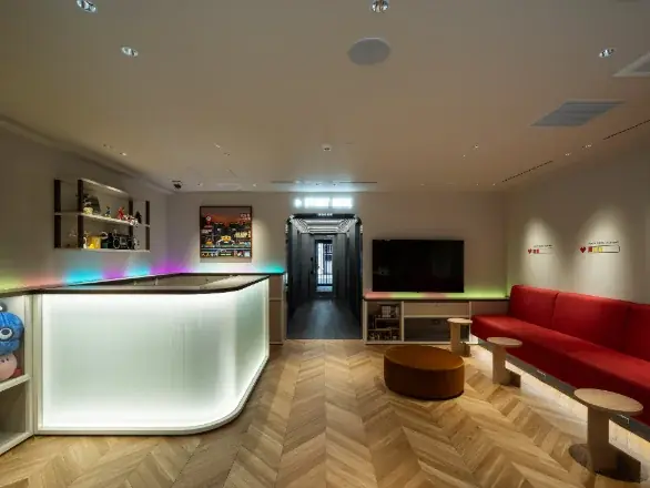 ロビーは「プレイヤーとしてログインする感覚」をコンセプトにした空間設計です。ゲームの世界観を表現するアートやピクセル表現を取り入れ、訪れる世代や国籍を問わず共感を得られる演出が施されています。
