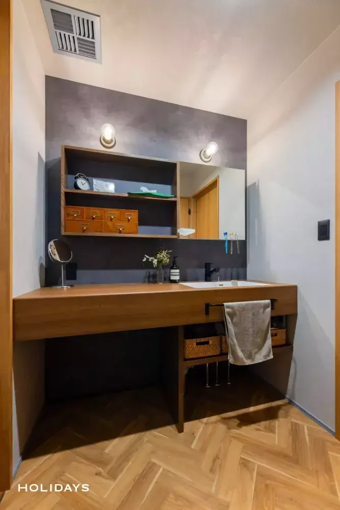 洗面室はオープン収納をディスプレイ感覚で使えるように設計しながら、鏡の裏にも収納を確保するなど機能性にも配慮しています。背面はダークグレーの壁でアクセントをつけ、意匠性を高めています。
