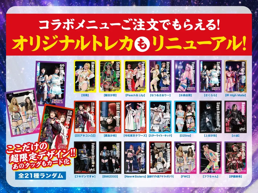 店内装飾の刷新に合わせて、コラボメニューを注文した方には「スターダム店限定オリジナルトレーディングカード」(全21種、ランダム)を1品につき1枚進呈します。2月1日以降はトレーディングカードのラインナップが順次入れ替わります。