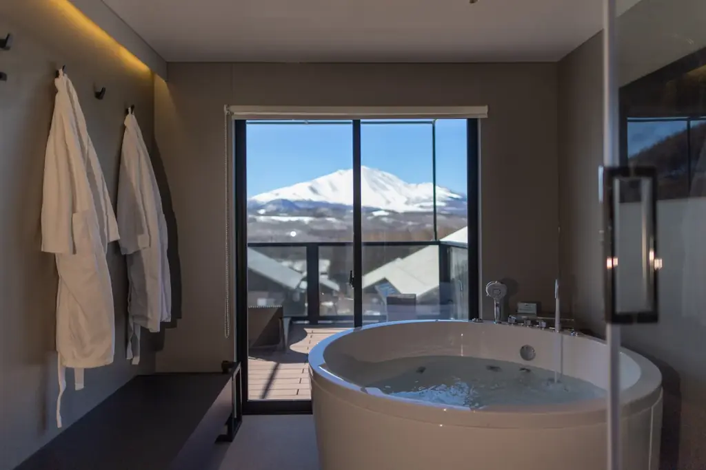散策後は客室のプライベートサウナや、浅間山を望むジェットバスで身体を温めることができます。冷たさと温もりの対比により身体の循環を促し、精神的な安らぎと身体的な回復をもたらす設計です。