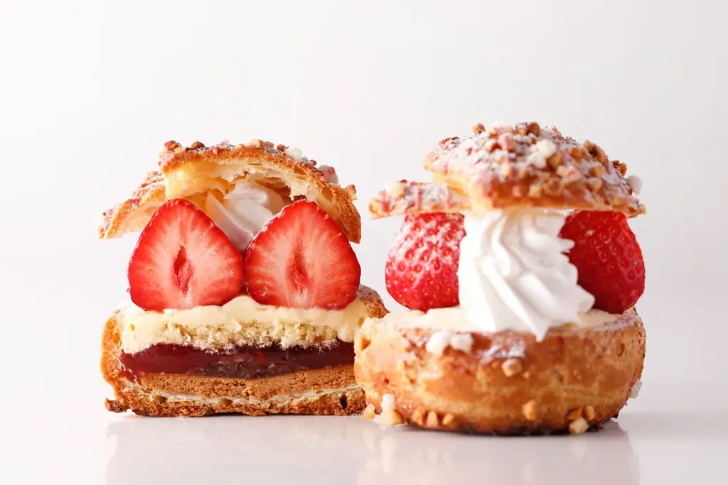 『スーパーあまおうシュークリーム』は複数の味覚層を同時に体験できる設計です。カスタードのコク、黒蜜あんこの和の甘さ、あまおうジュレの酸味、スポンジの柔らかさ、最後にクリームといちごの果実感が口内で交差します。